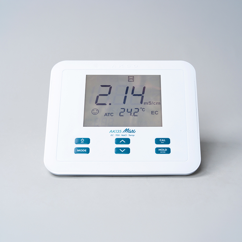 Opera em ampla faixa de medição; portanto, permite analisar desde águas de baixa mineralização até soluções de maior condutividade. Utiliza célula K=1,0 com sensor de temperatura integrado (AK1020); dessa forma, assegura compensação automática e correção dos resultados conforme a temperatura da amostra.